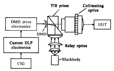 基于DMD的動態(tài)紅外景像仿真系統(tǒng)由以下幾部分組成:照明光源、DMD陳列、準(zhǔn)直光學(xué)系統(tǒng)、計算機圖像生成器CIG\DMD驅(qū)動電路等。由計算機圖像生成器產(chǎn)生紅外圖像數(shù)據(jù),通過DLP數(shù)字光處理視頻處理電路和DMD驅(qū)動電路輸入DMD器件。用照明光源(黑體)均勻照射DMD表面,利用DMD反射調(diào)制入射輻射,產(chǎn)生紅外熱圖像。生成的紅外景象通過準(zhǔn)直光學(xué)系統(tǒng)投射到被測系統(tǒng)的入瞳處,使紅外景與真實目標(biāo)與背景在探測器上的像斑大小、輻射能量空間分布一致,以達到評價被測系統(tǒng)性能的目的。