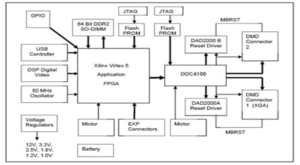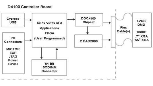 - F4100 系統(tǒng)在DLP 開發(fā)應(yīng)用中提供完整的接口(USB 或擴展接口),數(shù)據(jù)處理(Virtex-5、DDR),DMD 控制器(DDC4100、DAD2000、DMD),左圖是F4100控制平臺的簡化原理框圖: